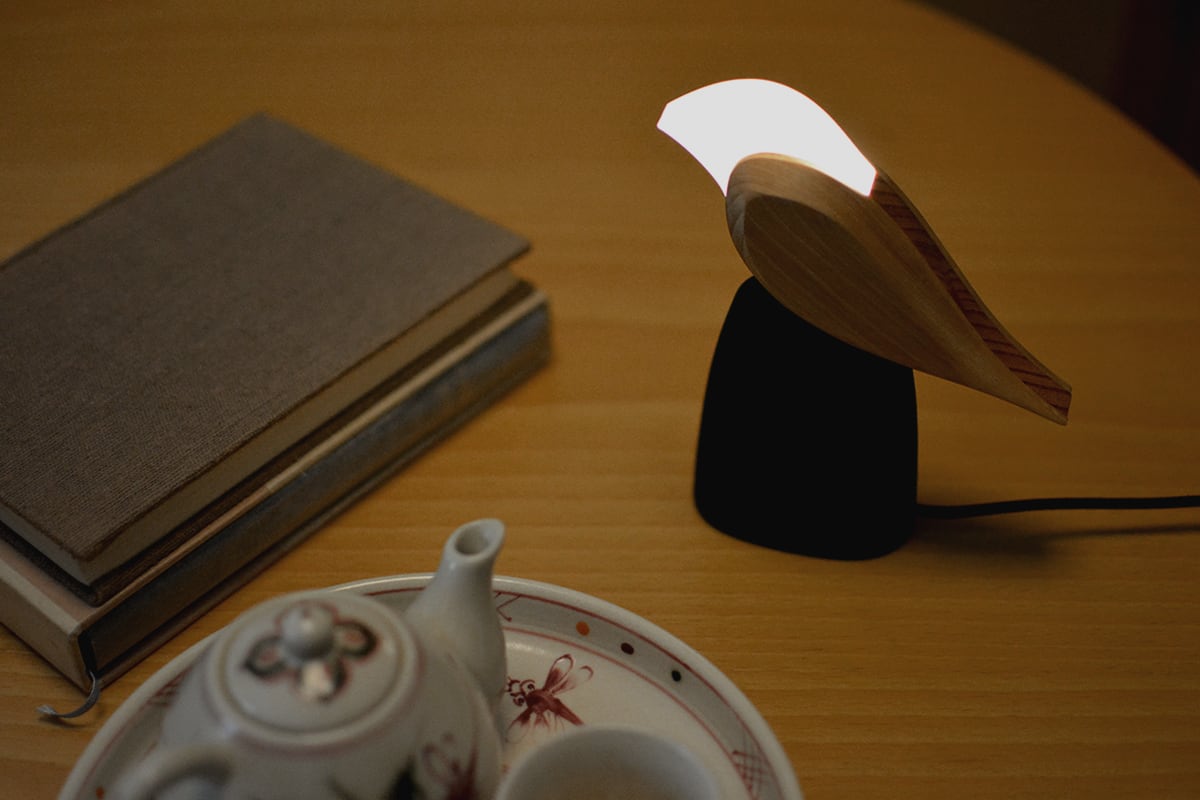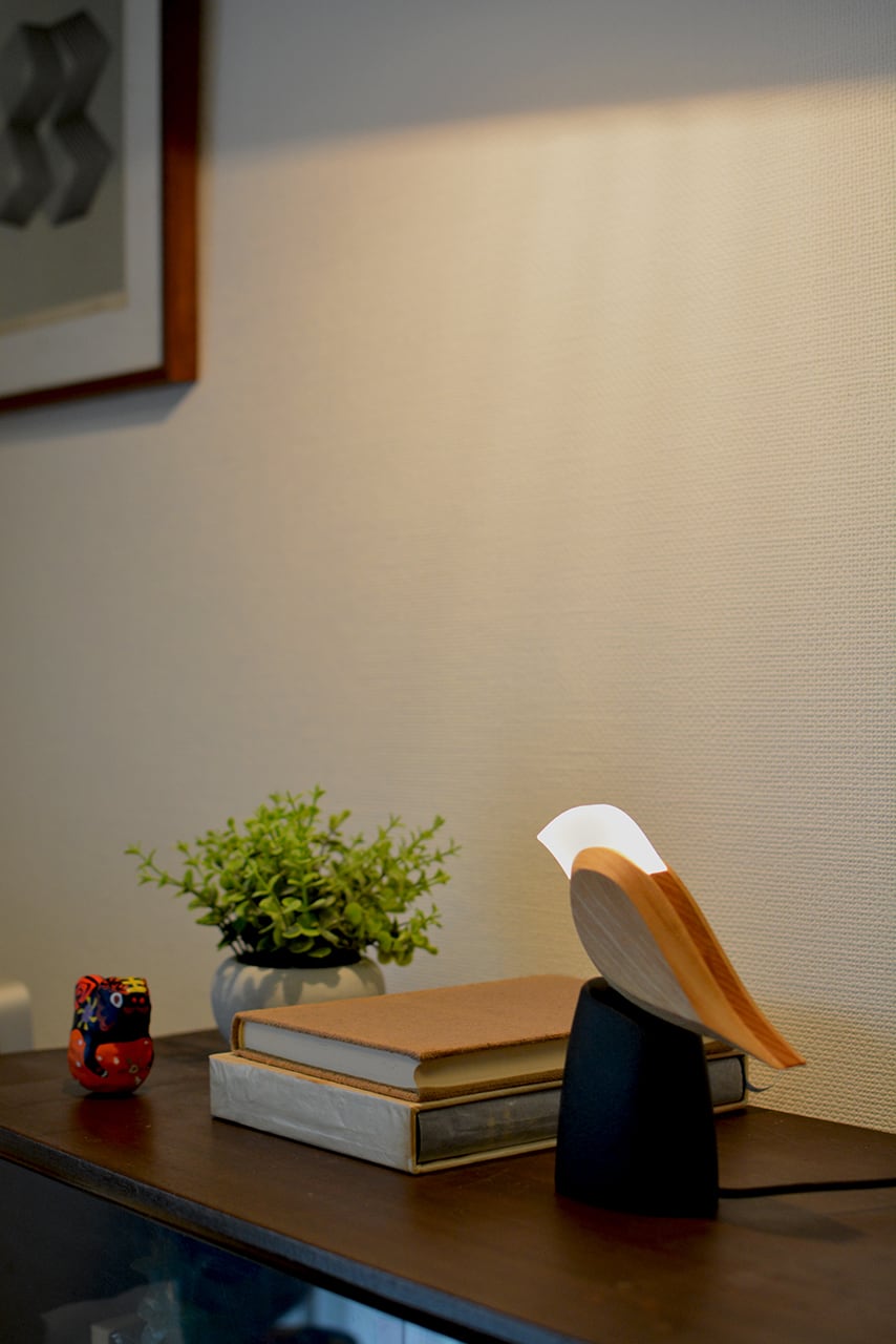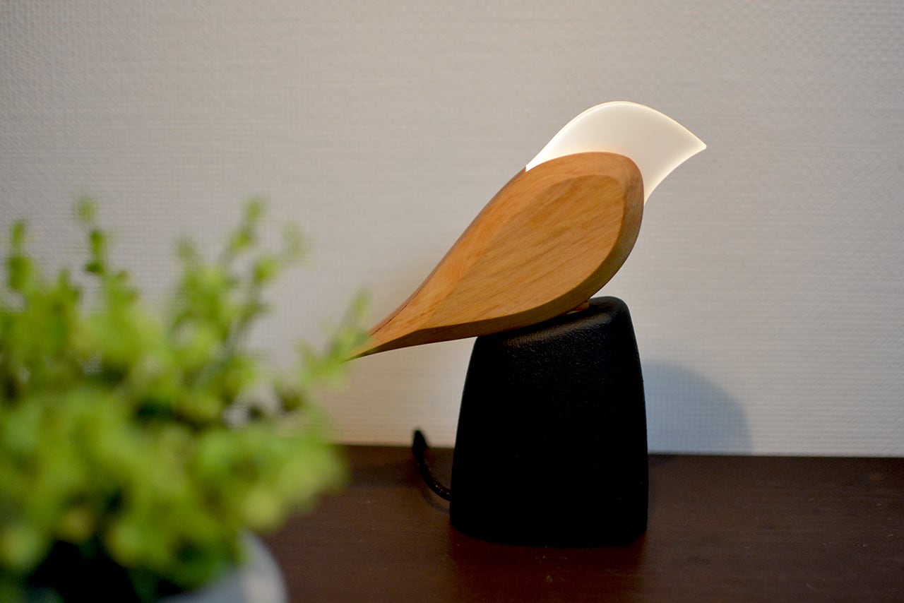 南部鉄器とサクラ材、ケヤキ材などで作られたシンプルな小鳥の形の照明です。
